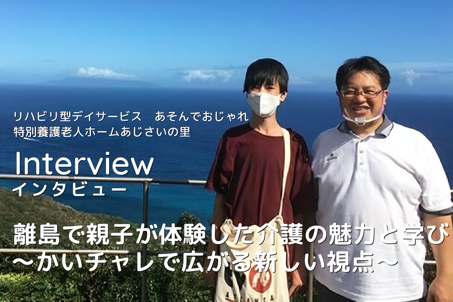 親子でかいチャレに参加した小林さん親子 息子さん(三宅島で体験) お父さん(八丈島で体験) 東京の離島、八丈島と三宅島で父と息子がそれぞれ介護体験に挑戦しました。海と山に囲まれた穏やかな島で、二人が出会ったのは、想像以上に温かく、奥深い介護の現場。親子ならではの視点で見つけた気づきや学びを、リアルな声とともにお届けします。 Contents(目次) 【インタビュー】 親子でかいチャレに参加した小林さん親子 事業者情報 【インタビュー】 親子でかいチャレに参加した小林さん親子 かいチャレスタッフ : まずは簡単に自己紹介と、今回かいチャレに参加したきっかけを教えてください。 小林さん・父 : 高校で社会科の教員をしています。息子がかいチャレに挑戦していて、楽しそうにやっている姿を見て、自分もやってみたいと思ったのがきっかけです。 息子さん : 大学の文学部1年生です。大学では福祉とは関係ない分野を学んでいます。母にかいチャレを教えてもらい、これまでに2回参加しました。想像以上にやりがいがあると感じて、今回は三宅島で挑戦しました。 かいチャレスタッフ : 都内ではなく島の事業所を選んだ理由と、体験前の気持ち(不安や期待など)を教えてください。 小林さん・父 : 友人の奥さまが八丈島出身で、10年前に家族で招待してもらったことがあり、島には親しみがありました。体験前は不安はまったくなく、むしろ楽しみでした。普段からボランティア活動をライフワークにしているので、挑戦できることが嬉しかったです。 息子さん : 中学校の頃から『島留学』に憧れていて、高校も島を目指して見学に行ったことがあります。海に囲まれた生活への憧れがずっとあり、夏休みに行けるタイミングで迷わず選びました。島に行くのはもうワクワクでした。体験内容はこれまでと大きく変わらないだろうというイメージがあったので、落ち着いて臨めました。 かいチャレスタッフ : 実際に体験した業務や活動を教えてください。 小林さん・父 : 八丈島のデイサービスで、筋力トレーニングを主体にしたプログラムに同席しました。利用者さん一人ひとりの体力や体調に合わせて負荷を調整していて、科学的根拠に基づいたケアを徹底していることに驚きました。 息子さん : 三宅島では、1日目にデイサービスで半日体験しました。朝の体操や紙花づくりをしながら利用者さんと会話を楽しみ、昼食の食べた量を記録する業務も担当しました。2日目は特養での体験です。これまでデイサービスしか経験がなかったので、特養での入所型の「日常を支えるケア」を体感できたのが新鮮でした。 かいチャレスタッフ : 職場の雰囲気はいかがでしたか? 小林さん・父 : 職員の方々がとても細やかに対応してくださり、こちらにも丁寧に説明してくれたので、安心して関わることができました。 息子さん : みんな生き生きとしていて、スタッフさんが明るい雰囲気をつくっていました。広い施設は初めてで少し緊張しましたが、温かく迎えてくれたので、楽しく体験できました。 かいチャレスタッフ : 八丈島や三宅島での体験ならではの魅力や、印象に残ったことはありますか? 小林さん・父 : 島ならではの穏やかな空気と、時間がゆったり流れる感覚がありました。利用者さんや職員の方々との関わりの中で、家族のような絆を感じたのが印象的です。八丈島は今年、台風で大きな被害を受けたと報道で知りました。もし機会があれば、来年もおじいさんおばあさんの笑顔に会いに行きたいです。 息子さん : 三宅島の施設の窓から見える壮大な海と山の景色に感動しました。忘れられない風景です。この環境で暮らしたいと移住される方がいると聞きましたが、納得できます! さらに、島での生活ならではの発見もありました。施設では運動靴が必要ですが、施設外ではサンダルが断然便利。両方持っていくと快適です。島の店では履物が品薄で値段も高めなので、事前準備がおすすめです。 宿泊については、空港から宿までの送迎をお願いするとほとんど対応してくれます。空港からバスもありますが、利用者はほとんどいませんでした。 そして何より、星空が本当にすごかった!東京都なのに、こんな満天の星空は初めて見ました。 かいチャレスタッフ : 観光もする時間はありましたか? 小林さん・父 : 体験は2日間、滞在は予備日も併せて4泊5日なので少し時間があり、八丈島では車で島内を巡りました。 息子さん : 三宅島は自転車を借りて、天気の良い日を選んで島を一周。海風が気持ちよかったです。 かいチャレスタッフ : 食事や島の暮らしはどうでしたか? 小林さん・父 : コンビニがなく、商店は19時~20時頃に閉まるので、夜食やお菓子は持参しておくと安心です。宿の食事はとてもおいしく、魚は驚くほど新鮮でした。オンシーズンの宿泊は相場が上がりやすく、2食付きにすると料金が高くなるので、計画時には注意が必要ですね。 息子さん : 島のりラーメンがとってもおいしかっ